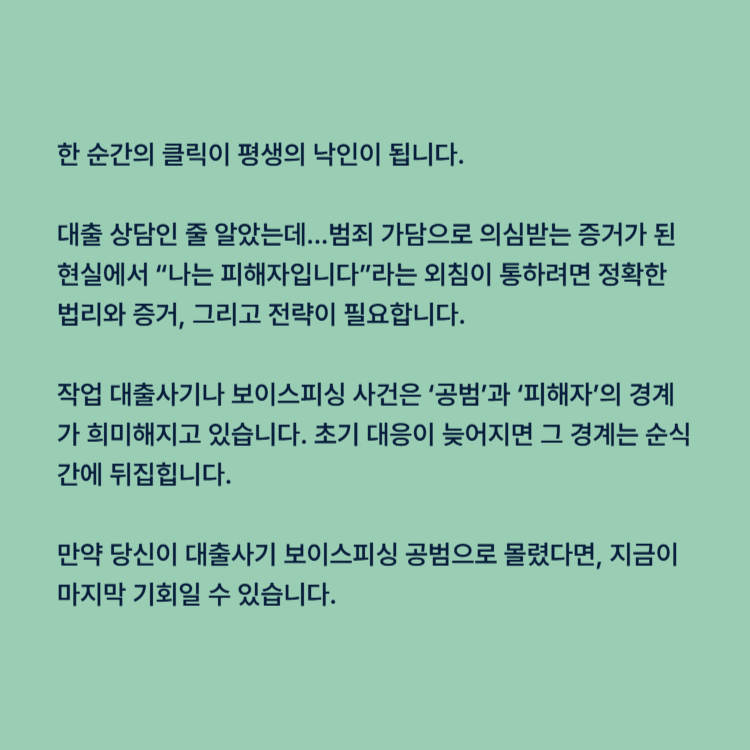 대출 상담인 줄 알았는데...범죄 가담으로 의심받는 증거가 된 현실에서 “나는 피해자입니다”라는 외침이 통하려면 정확한 법리와 증거, 그리고 전략이 필요합니다. 작업 대출사기나 보이스피싱 사건은 ‘공범’과 ‘피해자’의 경계가 희미해지고 있습니다. 초기 대응이 늦어지면 그 경계는 순식간에 뒤집힙니다.