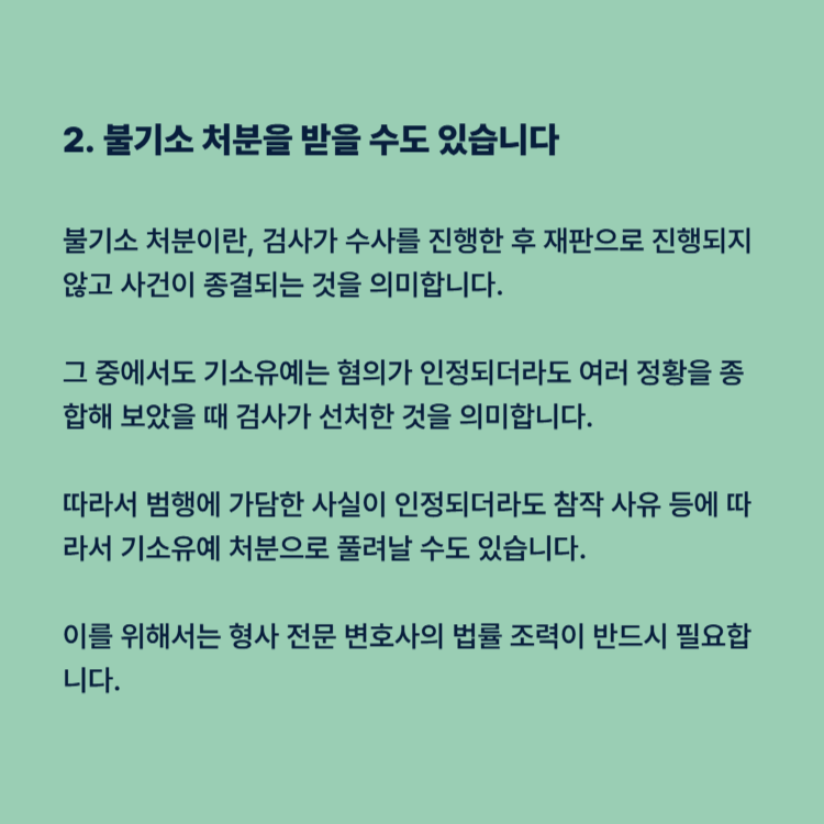위 사례의 A씨처럼 빠르게 변호사를 선임하고 사실관계를 입증한다면 기소유예나 불기소처분으로 마무리될 가능성이 있습니다. 반대로, 아무런 대응 없이 조사받는다면 ‘피해자’가 아닌 ‘가해자’로 남게 될 수도 있습니다.