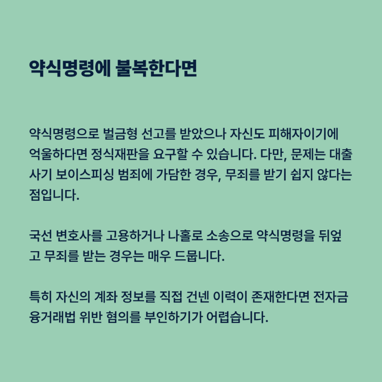 정말 억울하게 혐의를 받게 되었는데 벌금형의 선고에 이른다면, 자신이 보이스피싱으로 인해 피해를 당한 것임에도 가해자가 될 수 있는 것입니다. 문제는 위와 같은 상황에 무죄를 받기 위해서 정식재판을 청구하는 것이 쉽지 않다는 점입니다.