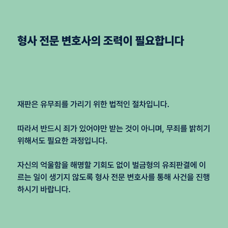 재판은 유무죄를 가리기 위한 법적인 절차입니다. 따라서 반드시 죄가 있어야만 받는 것이 아니며, 무죄를 밝히기 위해서도 필요한 과정입니다. 자신의 억울함을 해명할 기회도 없이 벌금형의 유죄판결에 이르는 일이 생기지 않도록 형사전문변호사를 통해 보이스피싱 공범이 아님을 입증하는 증거를 수집해 정식재판을 청구하시기를 바랍니다.