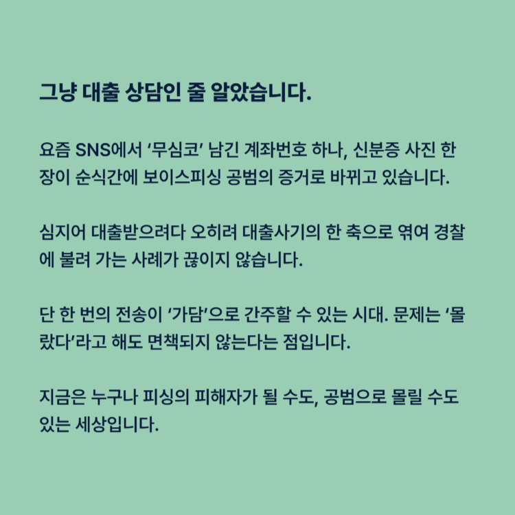지금은 누구나 피싱의 피해자가 될 수도, 공범으로 몰릴 수도 있는 세상입니다. 이제는 ‘나는 다르다’라는 생각보다 ‘대응이 필요하다’라는 판단이 먼저여야 합니다.
