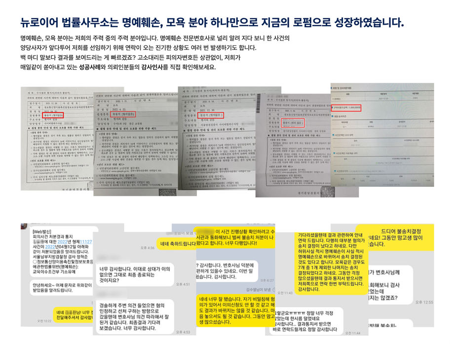 저희는 명예훼손, 모욕죄에 집중하며 모니터링 서비스를 통해 리뷰 삭제 및 처벌까지 적극 도움을 드리고 있습니다.
