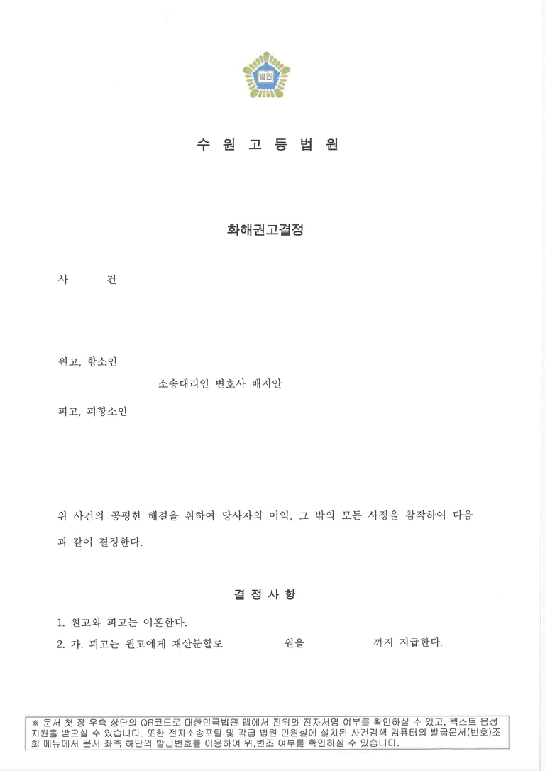 결국 2심에서 법원은 의뢰인의 억울함을 인정했고, 화해권고결정을 내려주었습니다.