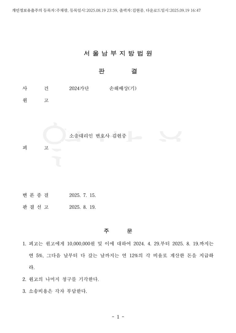 ****판결문을 보시면 아시겠지만 변호인으로서 제 이름만 들어가 있는 것을 확인하실 수 있습니다. 제가 온전히 혼자서 이끌어 낸 사례만을 저의 해결사례로 올리는 것이니 참고 바라며, 고용 변호사가 처리한 사건에서 제 이름만 들어간 사례라던 가 다른 변호사들과 함께 처리한 사건에서 제 이름이 들어갔다는 이유로 자신의 독자적인 해결사례인 것처럼 올리지 않습니다. 또한 착오가 없는 이상, 기존에 올렸던 해결사례를 일정 기간이 지난 후에 새로운 해결사례인 것처럼 재차 업로드 하지 않습니다. ****