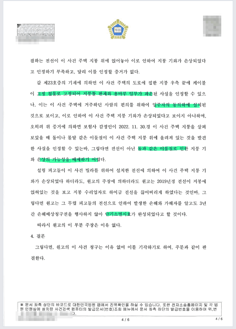 지붕위로 전선 작업자들이 올라가 작업하여 지붕이 파손되었다는 이유로 소를 제기하였으나