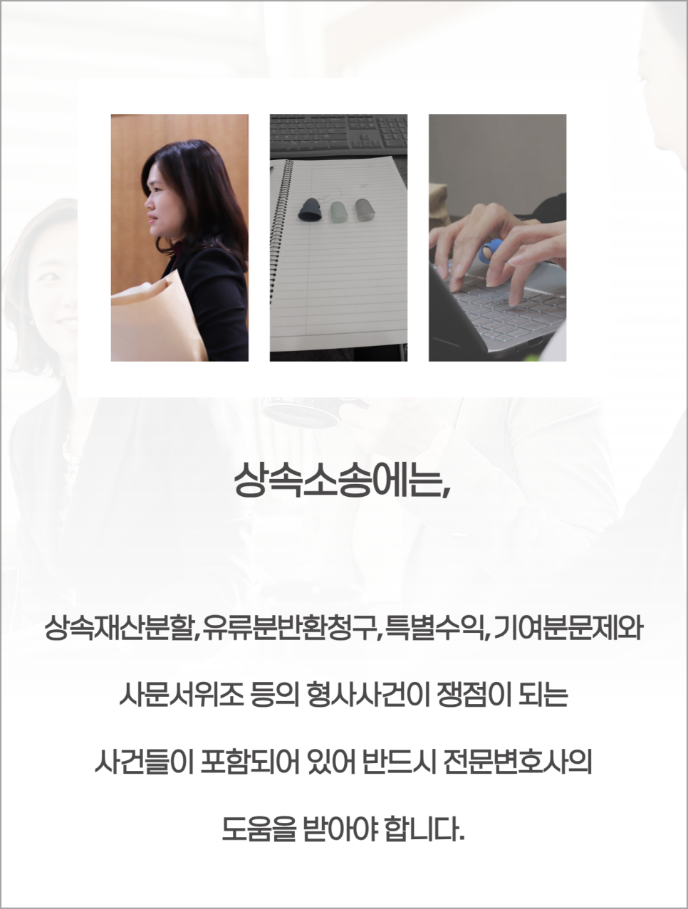 상속분쟁을 마무리할 수 있습니다. 상속소송의 경우 사전에 상속전문변호사의 도움을 받아 면밀하게 검토하여 대응하는 것이 반드시 필요할 것입니다.