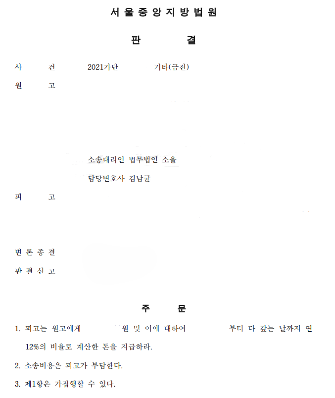 법원은 본 법인의 주장을 그대로 받아들여, “피고는 원고(의뢰인)에게 투자금을 지급하라”는 판결을 선고하였습니다.