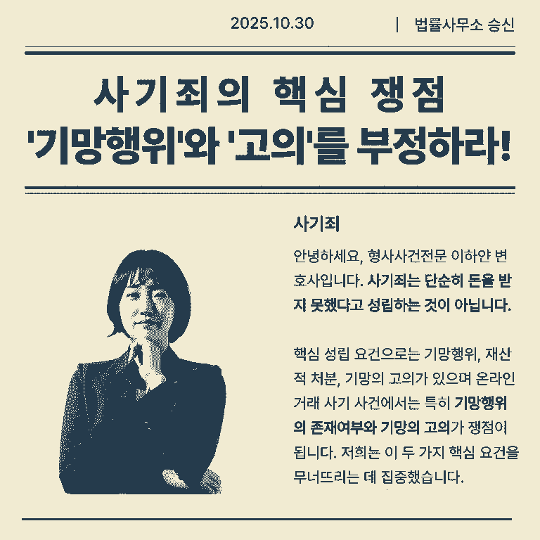 특히 ① 기망행위의 존재 여부와 ③ 기망의 고의가 쟁점이 됩니다.