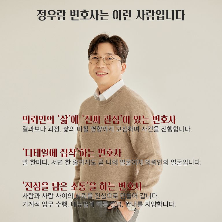 정우람 변호사는 결과를 넘어 의뢰인의 "삶"에 "진짜 관심"이 있는 변호사입니다.