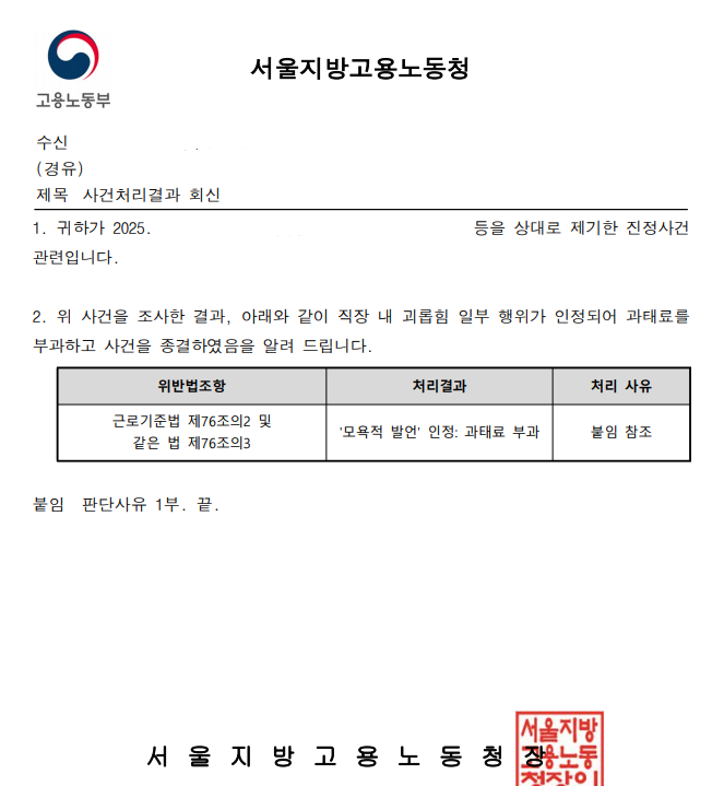 오늘은 실제로 제가 진행했던 사건 중, 대표이사의 교묘한 괴롭힘을 철저히 입증하여 노동청에서 ‘직장 내 괴롭힘’을 공식적으로 인정받은 사례를 소개드리려 합니다.