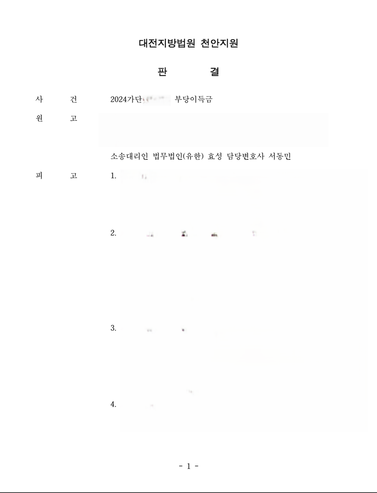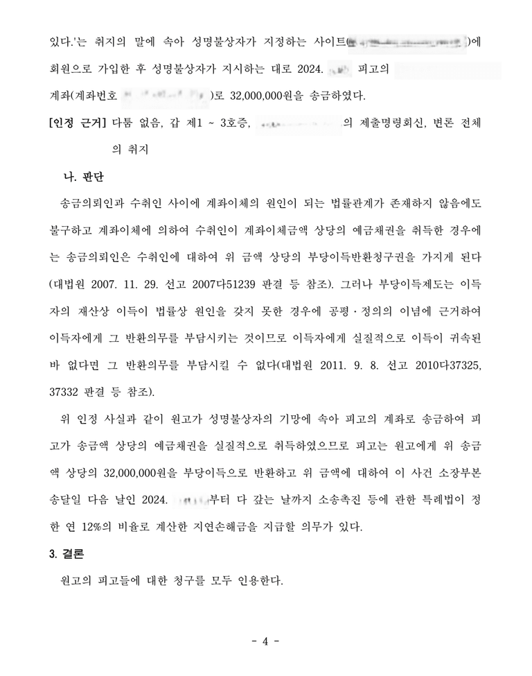 저는 즉각 입금 받은 자들을 피고로 하여 민사소송 부당이득반환청구소송을 제기하였고 법원은 원고 승소 판결을 선고하여 의뢰인은 피해액을 반환받았습니다.