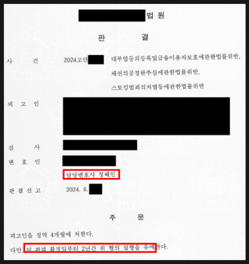 법원은, 의뢰인의 행위가 ‘무등록 대부업 영위’, ‘채권추심법 위반’, ‘스토킹처벌법 위반’에 해당한다고 인정하면서도, 피고인이 혐의를 인정하고 진심으로 반성하고 있으며, 범행의 동기, 범행 후의 정황 등을 참작하여, 징역 4개월에 집행유예 2년을 선고하였습니다.