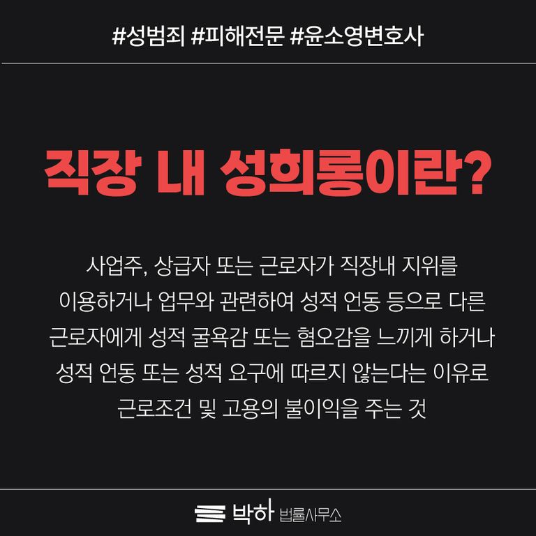직장 내 성희롱은 직장에서의 지위를 이용하거나 업무와 관련해 상대방에게 성적인 언동으로 굴욕감 또는 불쾌감을 주는 행위를 말합니다.
