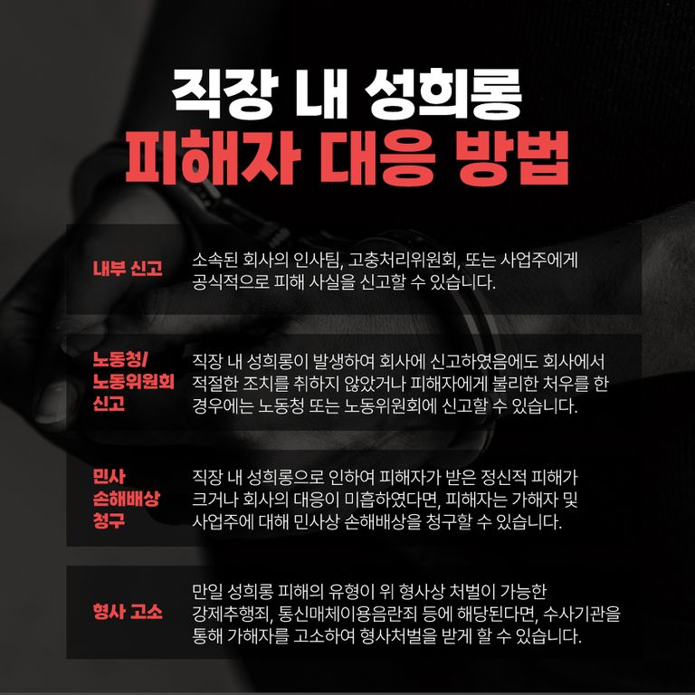 직장 내 성희롱은 행위의 방식과 수단에 따라 적용되는 규정과 처벌이 상이하기 때문에 피해 방식에 따른 적절한 절차가 필요합니다.