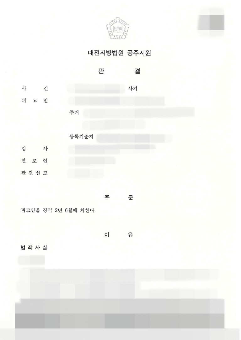 ![[고소사건] 변제의사 없는 편취 사기범 징역 2년 6개월 선고!](/_next/image?url=https%3A%2F%2Fd2ai3ajp99ywjy.cloudfront.net%2Fuploads%2Ftitleimage%2Foriginal%2F5b1a11aecd44dd0b0e2c1b12-original.jpg&w=3840&q=75)