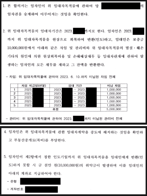 3. 합의 내용 : 명도기한 설정, 연체차임 정산, 위약금 및 원상복구 합의