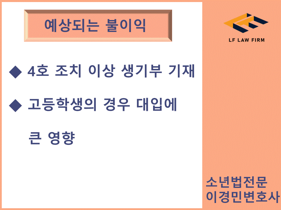 의뢰인의 경우 고등학교에 재학 중인 상태였고 학폭위에서 4호조치 이상이 나온다면 대학교 입시에 영향을 받는 케이스였습니다. 실제 대학별로 입시요강에 따라 학폭 처분 수위에 비례해서 불이익이 있는데요 졸업과 동시에 삭제가 되는 경우는 극히 예외적인 케이스이고 행정심판이나 행정소송으로 다시 다툰다 하더라도 애초에 내려진 처분이 취소되기는 어렵기 때문에 초기에 잘 대응하실 필요가 있습니다.