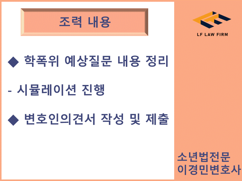 실제 학폭 접수 이후에 진지하게 반성하며 다시는 안 하겠다고 다짐하고 있는 상황이라 한 번 더 기회가 주어진 것이다 라고 말씀드렸고 사건을 조기에 원만하게 종결할 수 있었습니다. 학폭 사건의 경우 처음 신고가 접수된 후 이후 절차들은 정말 빠르게 휙휙 진행이 되는데요 준비해야 될 내용들이 많은 만큼 지체하지 마시고 상담부터 받아보시기를 권해드립니다. 오늘은 제가 실제 수행했던 사례 중 학폭 언어폭력 1호처분 사례를 말씀드렸고요 다음에는 또 다른 수행사례 내용으로 찾아뵙도록 하겠습니다.