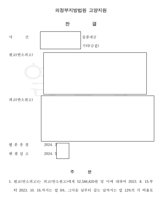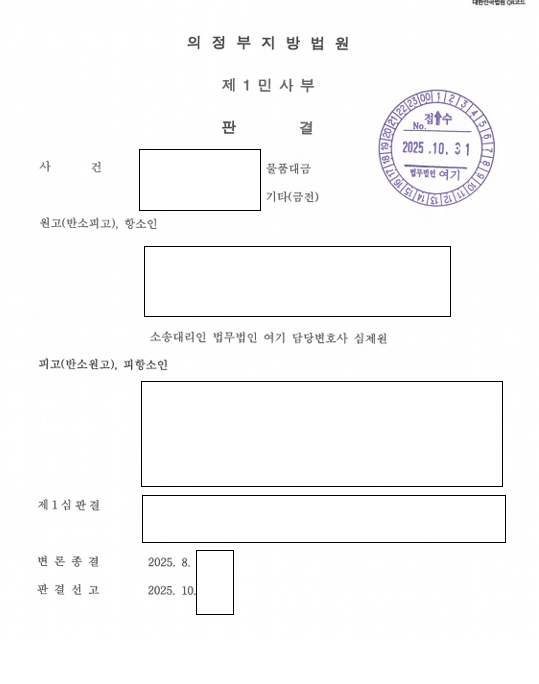 그리고 판결이 선고되었는데, 우리 측 주장이 인정되어 가맹계약은 맞지만 가맹금만 반환하면 된다고 판단을 하였고, 우리가 본소로 청구하는 물품대금은 반환하는 가맹금에서 공제를 하였습니다. 결과 1심에서는 5,200만원을 지급해야 하는 것이 약 900만원만 지급하면 되는 것으로 변경되었습니다.
