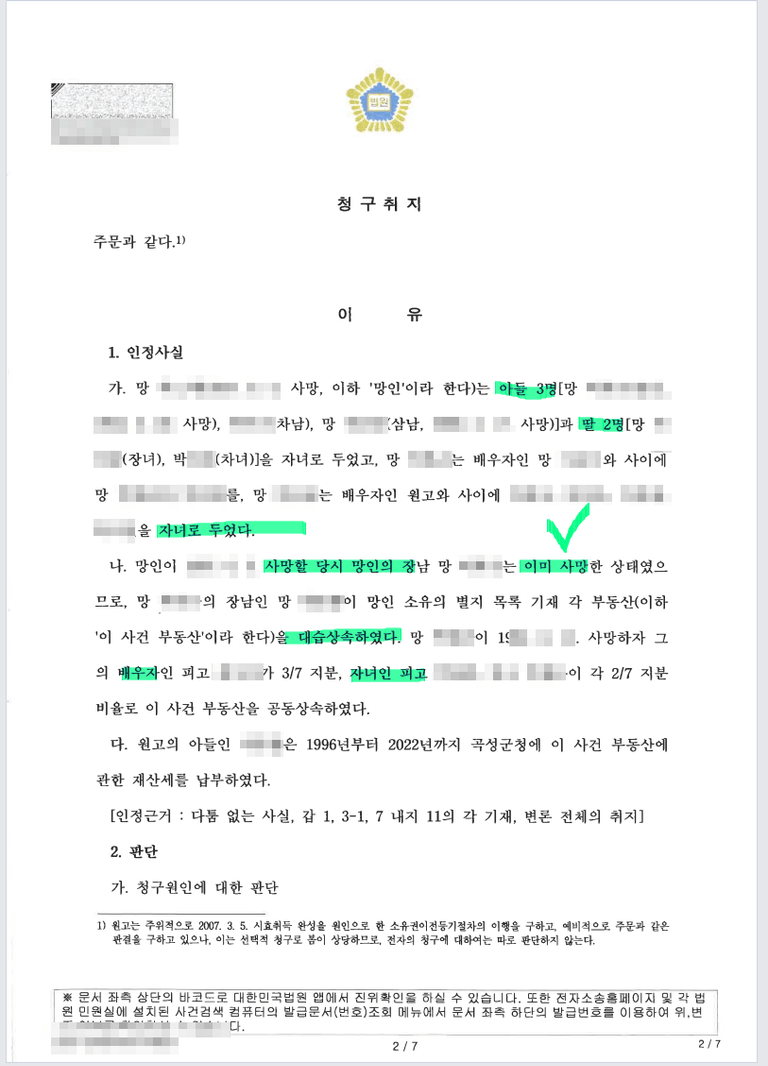 아버지의 형의 선 사망으로 인하여 이후 대습상속으로 인하여 상속을 받았지만