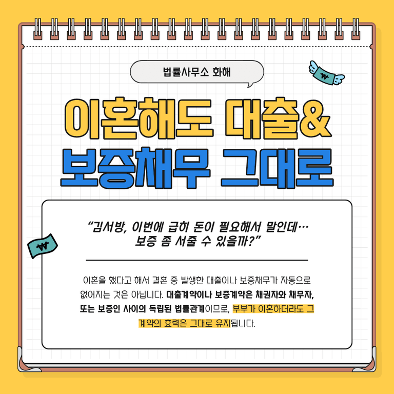 많은 분들이 짐작하시듯이, 이혼을 했다고 해서 결혼 중 발생한 대출이나 보증채무가 자동으로 없어지는 것은 아닙니다. 대출계약이나 보증계약은 채권자와 채무자, 또는 보증인 사이의 독립된 법률관계이므로, 부부가 이혼하더라도 그 계약의 효력은 그대로 유지됩니다.
