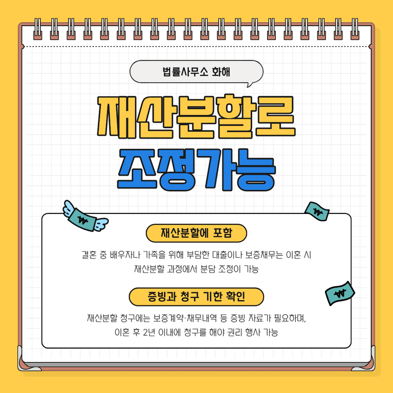 그렇다면 이혼한 사위나 며느리는 아무런 대책 없이 보증채무를 고스란히 떠안아야만 하는 걸까요? 다행히 법은 이런 불공평한 상황을 조정할 수 있는 방법을 제공합니다. 바로 재산분할 청구 절차를 통해서입니다. 재산분할은 단순히 혼인 중 모은 재산을 나누는 것만이 아니라, 한쪽 배우자가 부담하게 된 채무도 고려 대상이 됩니다.