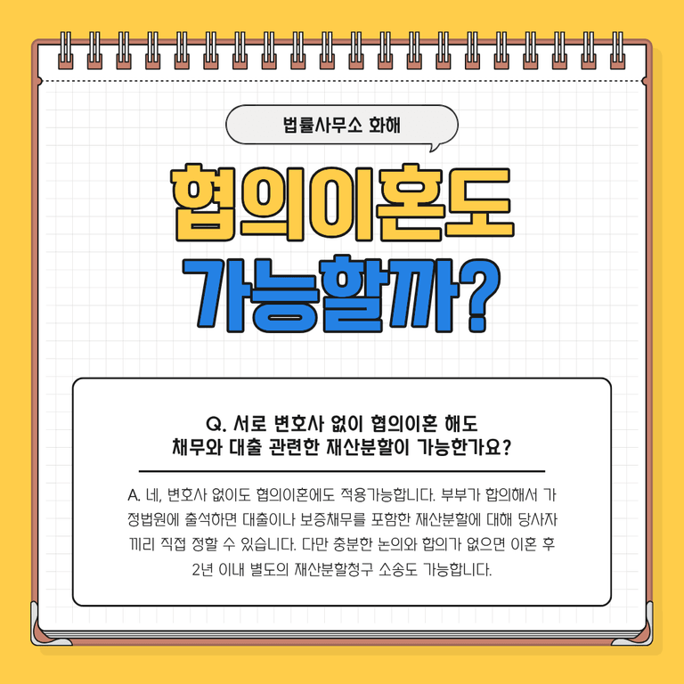 그렇다면 꼭 조정이혼이나 재판상 이혼을 해야만 재산분할이 가능한 걸까요? 아닙니다. 협의이혼의 경우에도 당사자끼리 충분히 협의하여 대출이나 보증채무 등 혼인 중 발생한 부채 문제를 재산분할 대상에 포함해 조정할 수 있습니다.