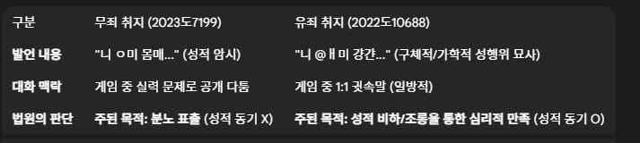 대법원 판단 (무죄 취지): "두 사람은 게임에서 처음 만나 성별도 몰랐다. 게임 실력 문제로 다투다가 격분하여 나온 말이다. 전체 맥락을 볼 때, 주된 목적은 성적 만족이 아닌 '분노의 표출'로 보인다."
