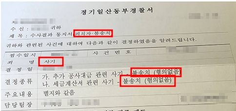 경찰은 제출된 자료와 진술을 종합적으로 검토한 끝에 의뢰인에게 사기의 고의가 없었음을 인정하였고 결국 공사대금 사기 혐의에 대해 ‘혐의없음(불송치)’ 결정을 내리게 되었습니다.