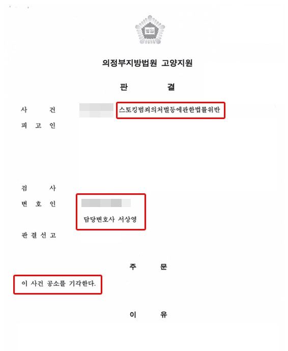 스토킹범죄는 현재(2024년 7월 개정 이후) 반의사불벌죄가 폐지되어 피해자와 합의하더라도 형사처벌을 피하기 어렵지만,의뢰인의 사건 당시에는 합의가 공소기각(무죄) 판결로 이어질 수 있었던 시점이었습니다.