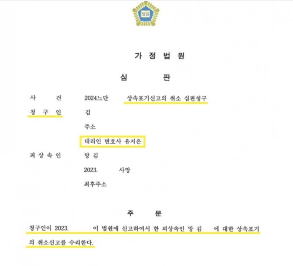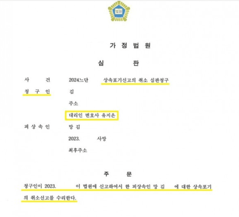 이런 경우 상속포기서를 작성하고 법원에 신고를 하게 되는데, 상속포기 결정을 받기 전 나머지 상속인들이 상속재산분할협의를 하게 되면 이는 무효가 됩니다.