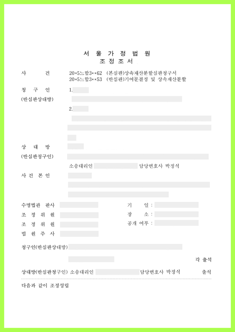 2. 보험금 채권은 보험약관에 있는데로 처리하기로 하면서, 청구인들과 상대방은 향후 피상속인의 상속재산에 관하여 민사, 가사, 형사 등 일체의 청구(유류분반환청구 포함)를 하지 아니하는 내용으로 조정이 성립되었습니다.