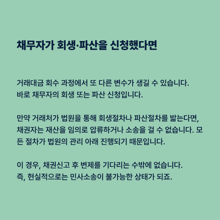 만약 거래처가 법원을 통해 회생절차나 파산절차를 밟는다면, 채권자는 재산을 임의로 압류하거나 소송을 걸 수 없습니다. 모든 절차가 법원의 관리 아래 진행되기 때문입니다.