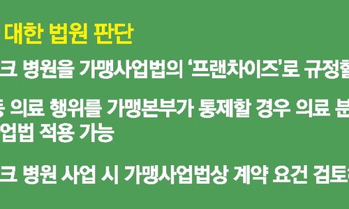 제가 예전에 했던 포스팅에서는 네트워크 병원이라도 가맹사업법이 적용되지 않는다고 장담할 수 없다. 그런데 의료경영지원회사 관련 업게에서는 가맹사업법이 적용되지 않는다고 주장을 한다는 포스팅을 적었습니다. 그리고 실질적인 내용이 가맹사업에 해당한다면 가맹사업법이 적용이 불가능한 것이 아니라고 판단을 하였습니다. 이하 2023. 9. 1. 포스팅 내용입니다. 그리고 그때에도 수면 밑에서 많은 문제가 되고 있으니 조만간 수면 위로 올라올 것 같다고도 말씀을 드렸습니다.