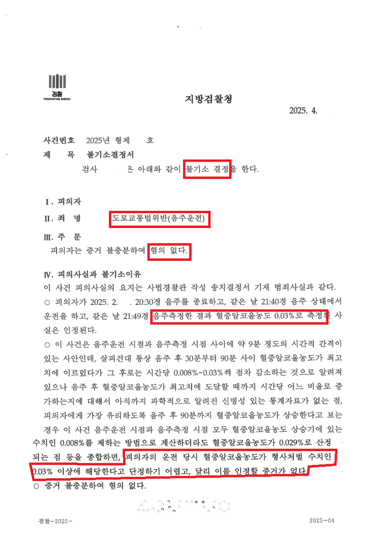 이번 포스팅에서는 혈중알코올 농도 0.03%의 음주운전으로 적발되었지만 무혐의(불기소) 처분을 받은 사건을 소개해 드렸습니다.