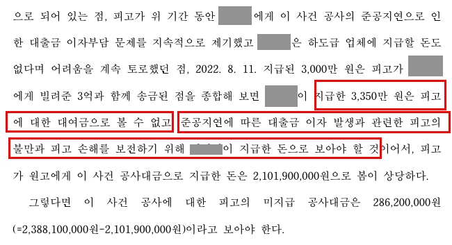 이상과 같이 상대방은 준공지연에 따라서 증가하는 건축주의 대출이자 부분 손해를 보조했던 금원 3,350만 원을 마치 건축주에게 대여한 금원이라는 주장을 하였습니다.