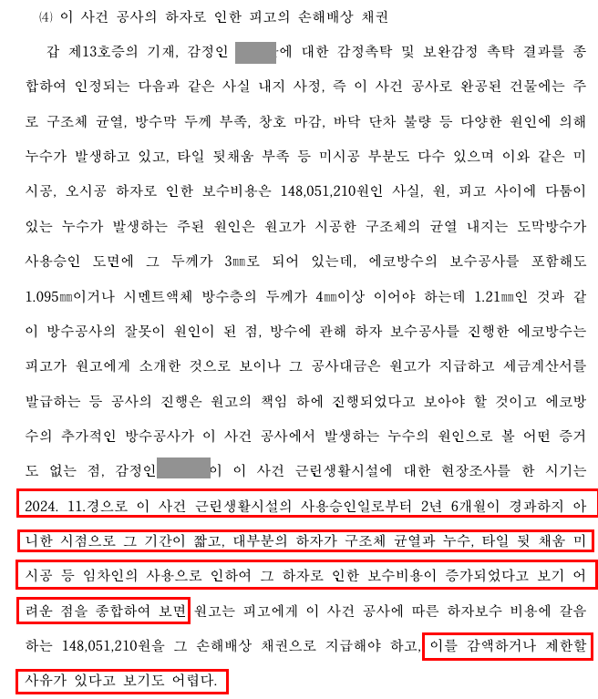건물의 하자 관련 손해배상액은 법원이 선정한 감정인의 감정을 통해서 입증합니다. 이번에도 감정인이 1차로 도출한 감정서의 오류를 지적하여 보완감정신청을 하였고, 그 결과 처음 하자보수비에서 1,400만 원 가량이 증액된 약 1억 5천만 원 가량의 최종 감정서를 받게 되었습니다.