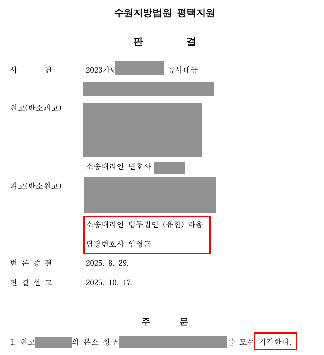 결국, 상대방 시공사의 청구금 약 3억 1,600만 원 전액 기각시키는 결과를 받았습니다!^^