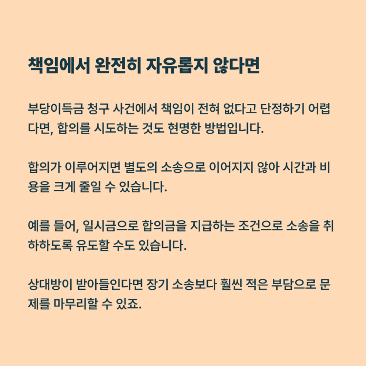 부당이득금 청구 사건에서 책임이 전혀 없다고 단정하기 어렵다면, 합의를 시도하는 것도 현명한 방법입니다.