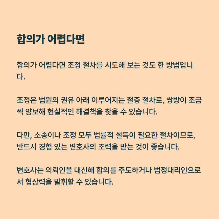 합의가 어렵다면 조정 절차를 시도해 보는 것도 한 방법입니다. 조정은 법원의 권유 아래 이루어지는 절충 절차로, 쌍방이 조금씩 양보해 현실적인 해결책을 찾을 수 있습니다.