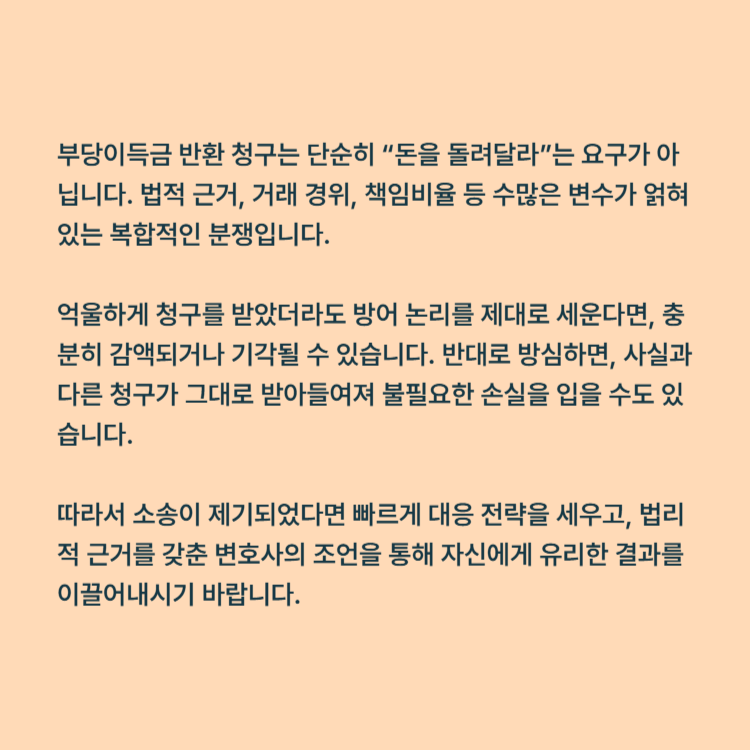 부당이득금 반환 청구는 단순히 “돈을 돌려달라”는 요구가 아닙니다. 법적 근거, 거래 경위, 책임비율 등 수많은 변수가 얽혀 있는 복합적인 분쟁입니다.