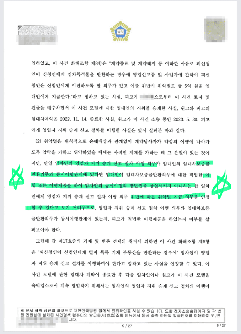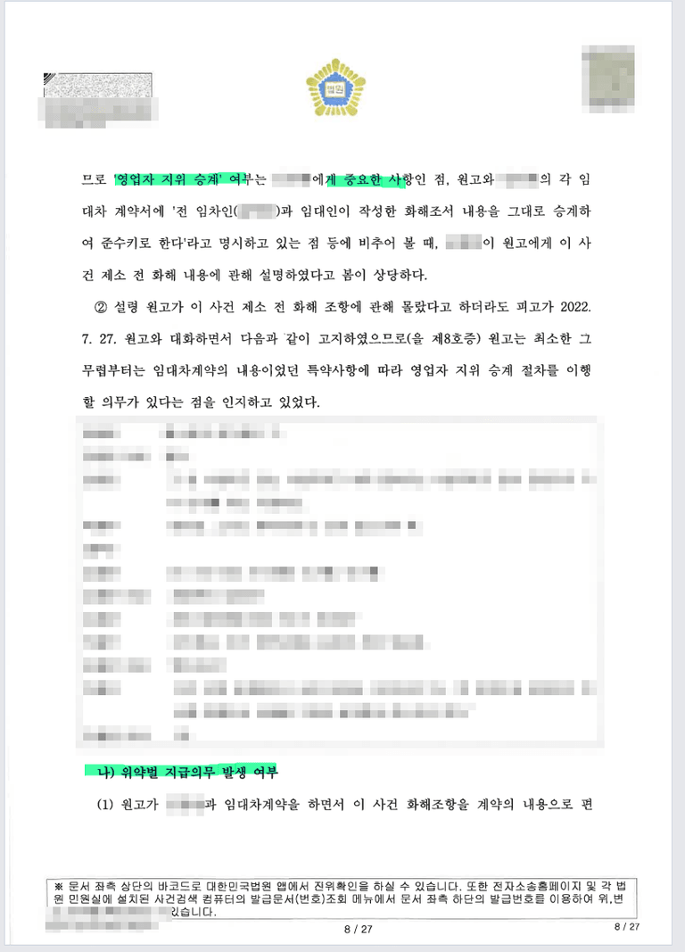 다만 임차인이 영업신고증은 주지 않아 의무위반은 하였지만