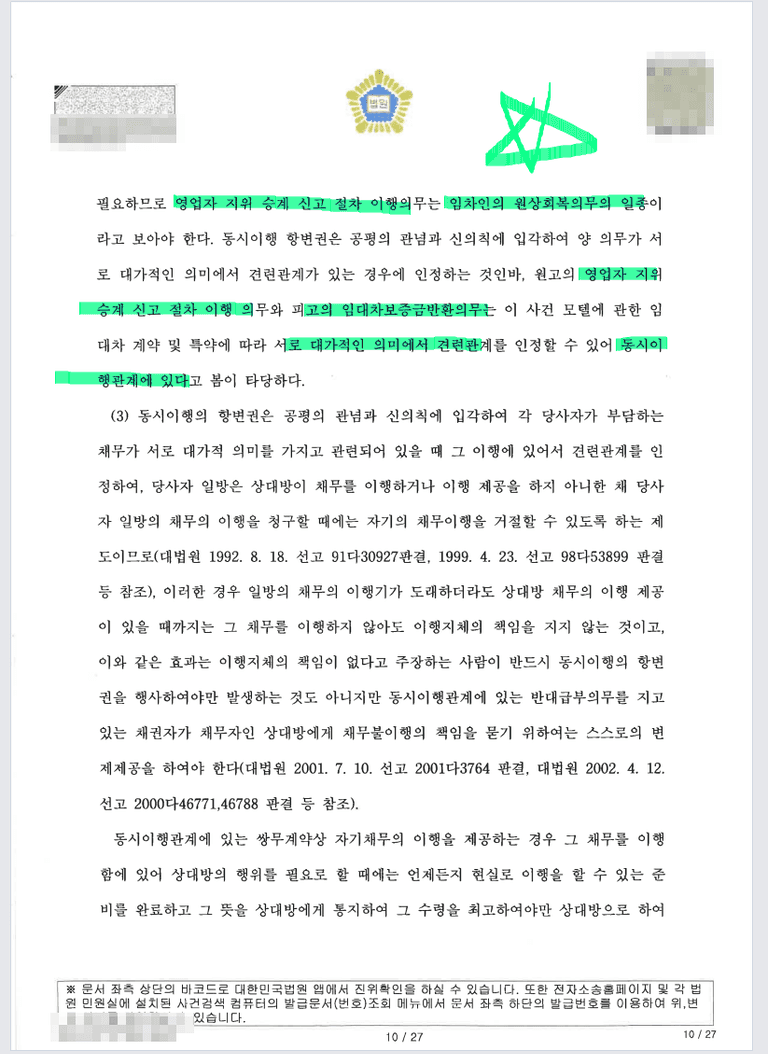 이행제공의무 등 동시이행의무를 다 하지 않아서 이에 대한 위약벌 및 손해배상은 청구할 수 없다고 함