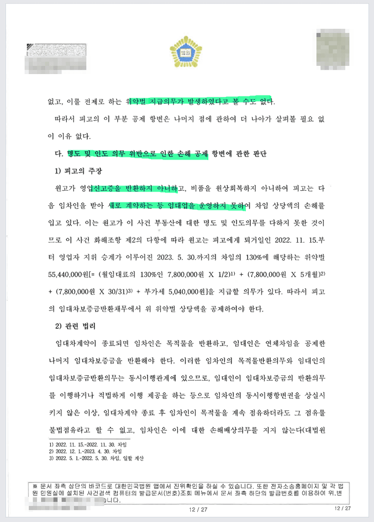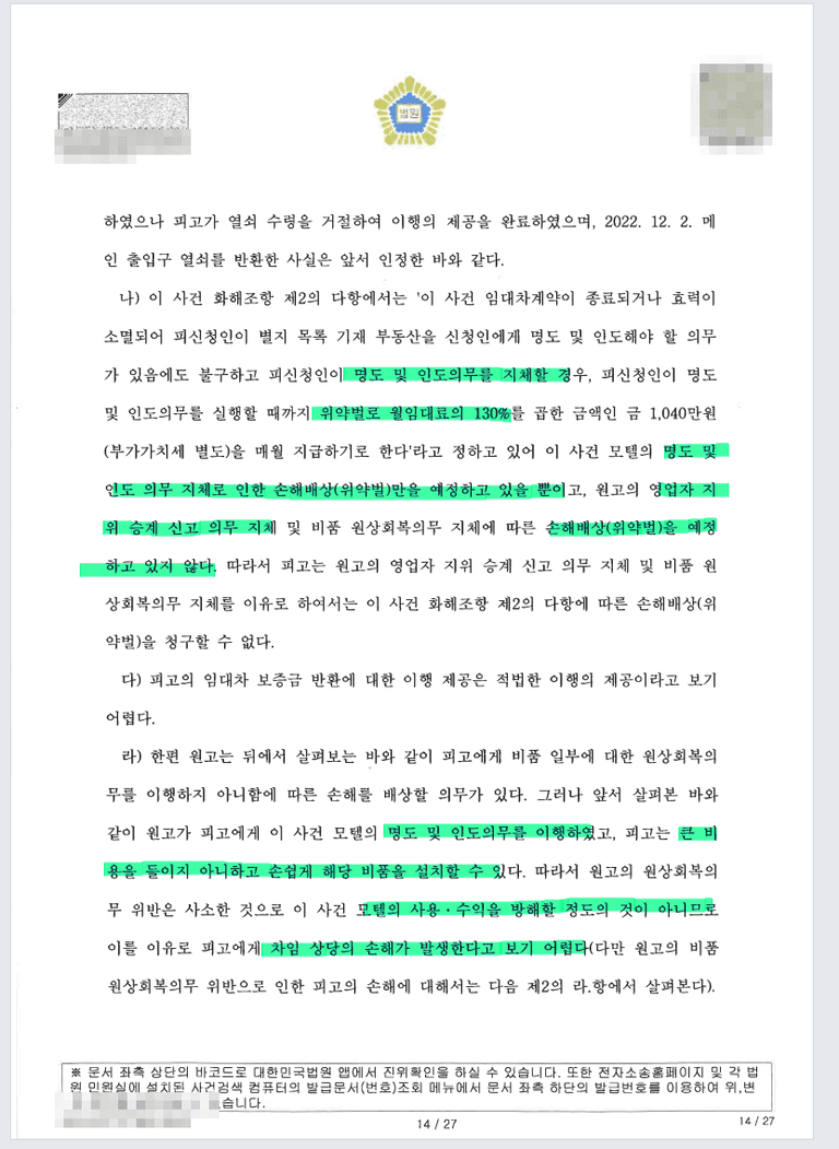 또한 비품은 금방 쉽게 채울 수 있는 것이라 이왕 퇴거한 김에 쉽게 채운 다음 영업은 가능했다고 보아 이에 대한 손해배상은 부정