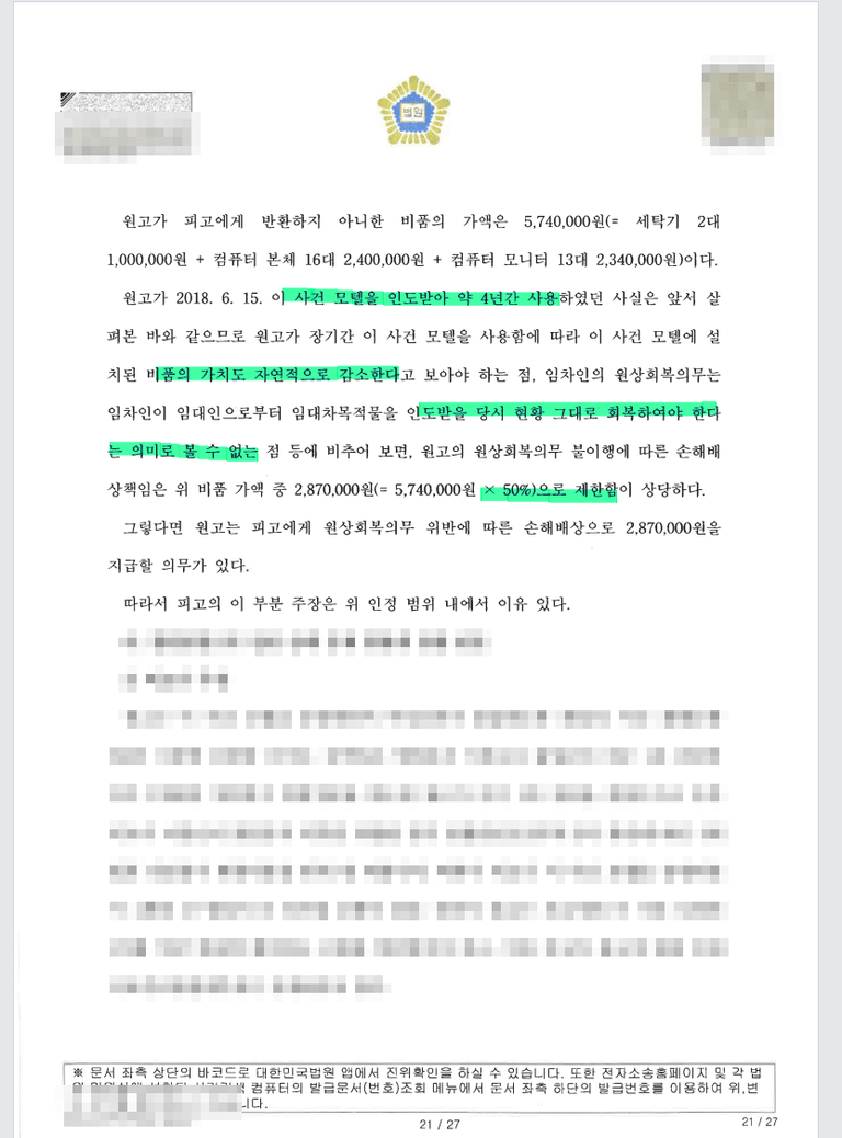 또 비품의 경우 임대차 시작 시점에의 온전한 상태로의 반환이 아니고 감가상각된 상태로 반환이 되는 것이므로 애초 가격의 절반으로 원상회복 가격을 인정한 사례