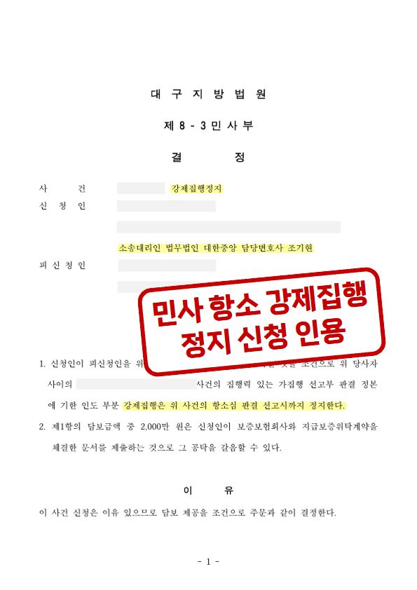 그런데 1심의 판결이 가집행되면 항소심을 진행하는 동안 의뢰인에게 현실적인 어려움이 있을 것이 분명했습니다. 이에 조기현 변호사는 1심 판결의 강제집행정지를 신청하였습니다.