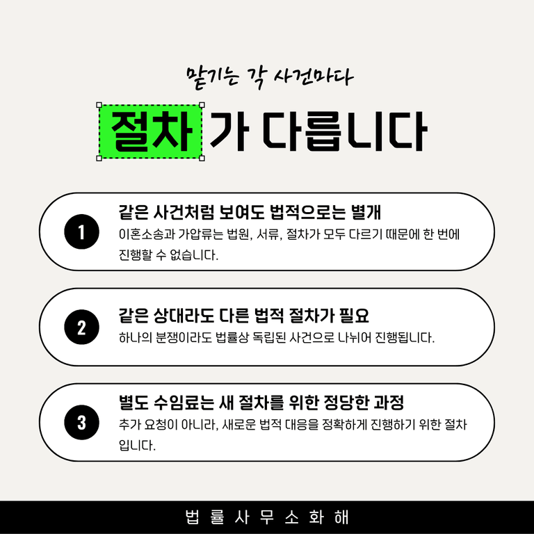 그래서 이혼소송만 맡긴 상태에서 가압류나 채권추심 같은 별도 절차를 진행하려면, 반드시 추가 위임이 필요합니다. 이는 변호사가 권한 없이 함부로 사건을 진행하지 않도록 하는 법적 안전장치이기도 하고, 반대로 의뢰인의 권리를 확실히 보호하기 위한 장치이기도 합니다.