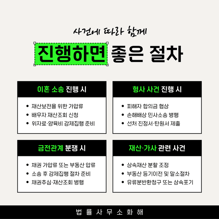 결국 법률사건은 분야에 따라 달라도, 병행 가능한 절차의 흐름은 대부분 유사합니다. 처음 상담할 때부터 “이 사건에 어떤 추가 절차를 함께 고려하면 좋을까”를 변호사와 상의해두면, 불필요한 시행착오 없이 한층 안정적이고 합리적인 해결책을 준비할 수 있습니다.