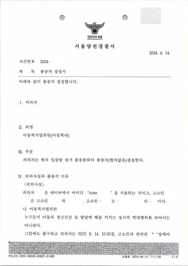 결국 경찰수사관은 피의자의 발언의 정도가 아동의 정신건강 및 발달을 저해하는 결과가 발생할 위험이 있는 정도에 해당하지 않는다는 이유로 피의자에게 불송치처분을 내려 주었습니다.