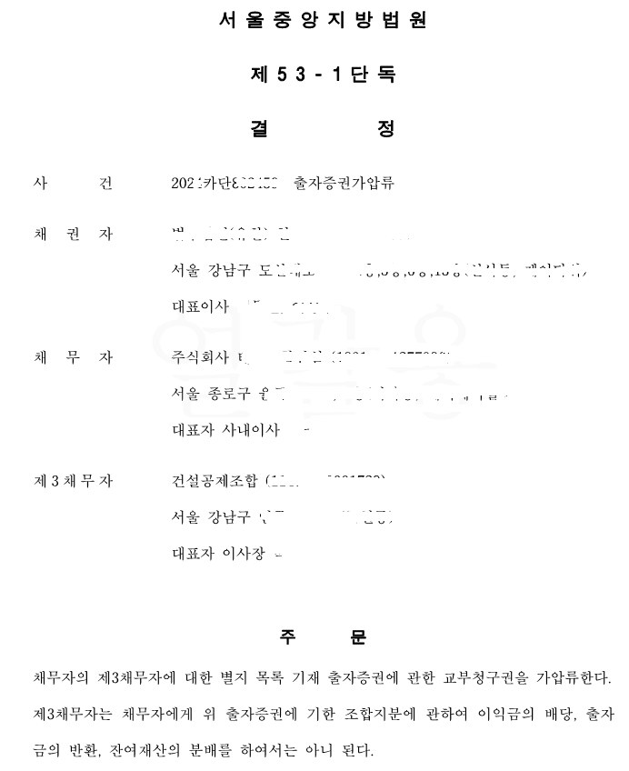 오늘은 건설사 등의 채무자가 채무를 불이행하는 경우, 채무자가 가입한 건설공제조합의 출자증권을 가압류하는 것을 설명 드리려고 합니다.